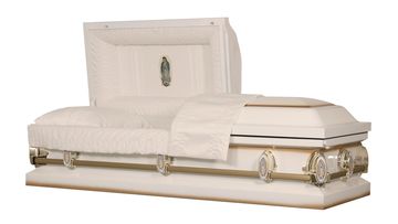 White w/Gold Pinstripe, White Crepe Interior, Cross w/Praying Hands Head Panel